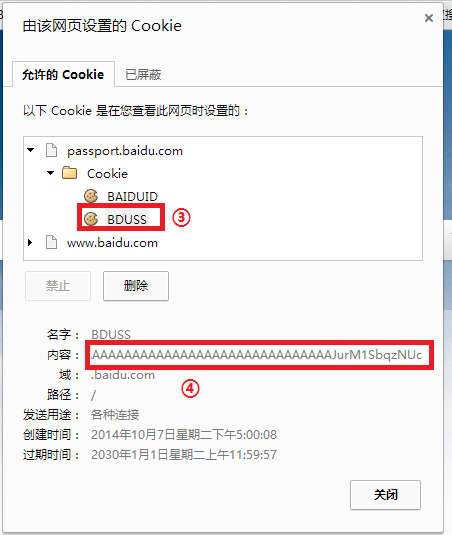 1.使用 Chrome 或 Chromium 内核的浏览器 2.打开百度首页 http://www.baidu.com/ 3.右键,点击 查看网页信息 4.确保已经登录百度,然后点击 显示 Cookie 和网站数据 5.如图,依次展开 passport.baidu.com -> Cookie -> BDUSS 6.按下 Ctrl+A 全选,然后复制并输入到上面的表单即可 请注意,一旦退出登录,可能导致 BDUSS 失效,因此建议在隐身模式下登录